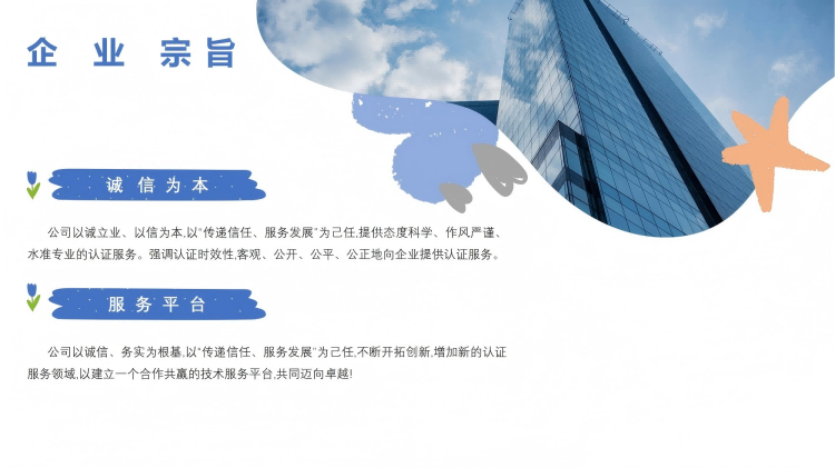 公司简介 新创信国际认证有限公司,成立于 2021 年,具有独立法人资格,公司秉承“科学的、公正的、诚信的、务实的,向顾客提供满意的认证服务”的宗旨开展认证活动。严格遵守国家法律法规,以诚立业、以信为本,提供态度科学、作风严谨、水准专业的认证服务;强调认证时效性,客观、公开、公平、公正地向企业提供认证服务。公司将以诚信、务实为根基,以“传递信任、服务发展”为己任,不断开拓创新,增加新的认证服务领域,以建立一个合作共赢的技术服务平台,共同迈向卓越!