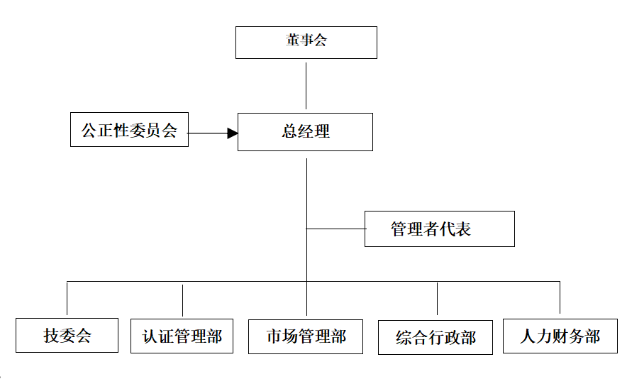 公司设立:董事会、公正性委员会、总经理、管理者代表;并拥有以下部门:技委会、认证管理部、市场管理部、综合行政部、人力财务部
